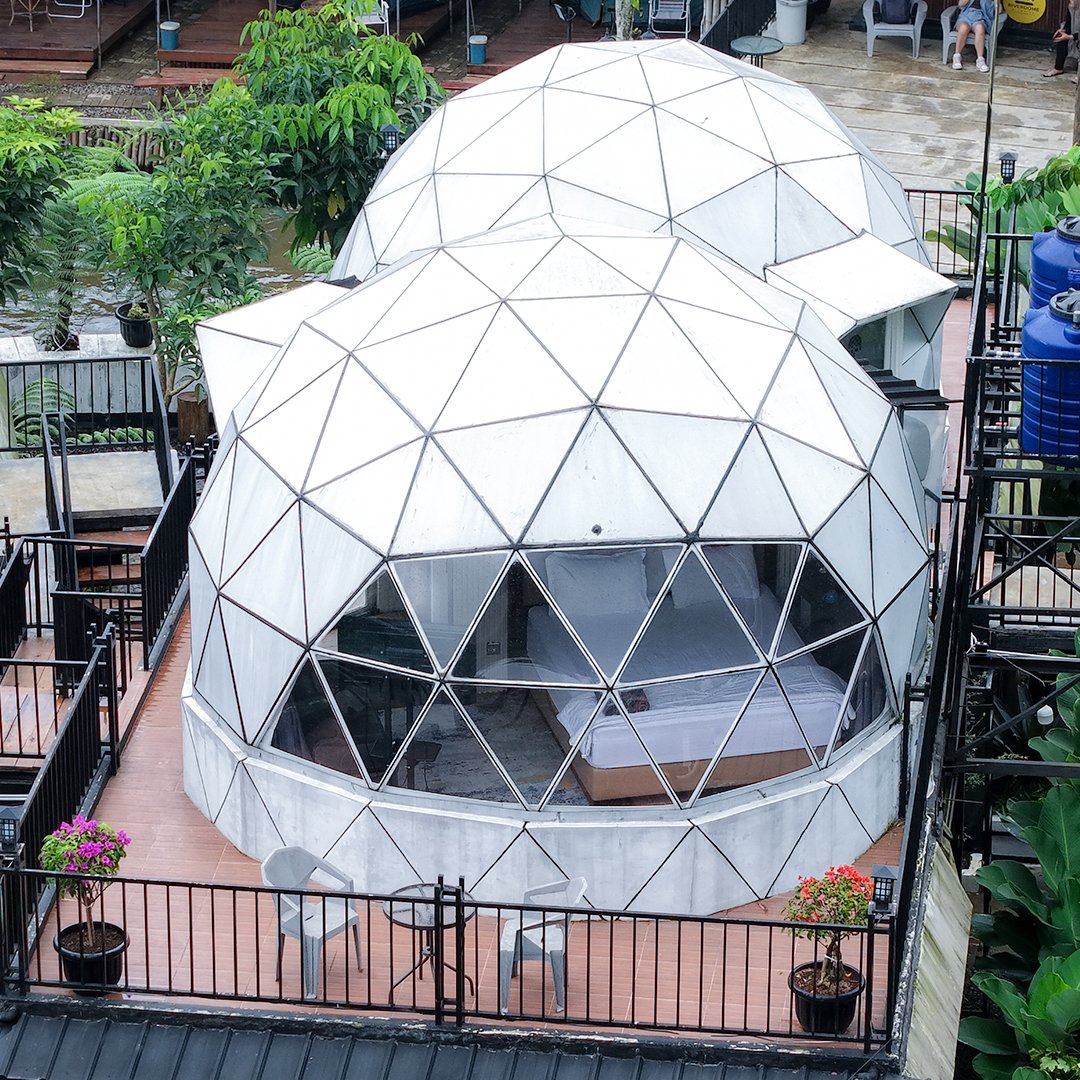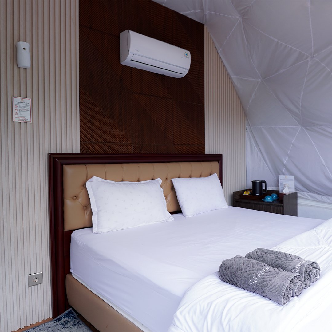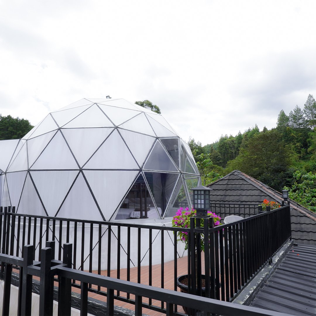 Tipe Dome 4 glamping ini menawarkan pemandangan kebun teh hijau. Suasana sejuk dan tenang menjadikannya pilihan ideal bagi tamu yang mencari penginapan glamping dengan view kebun teh yang asri dan menenangkan.